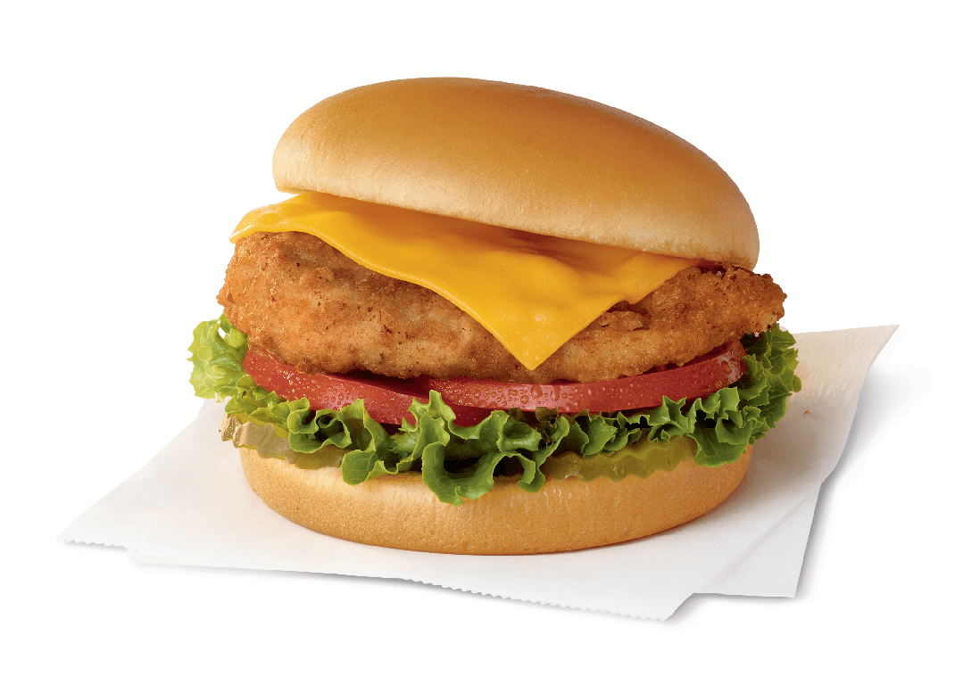 A boneless breast of chicken seasoned to perfection, hand-breaded, pressure cooked in 100% refined peanut oil and served on a toasted, buttered bun with dill pickle chips, Green Leaf lettuce, tomato and American cheese.