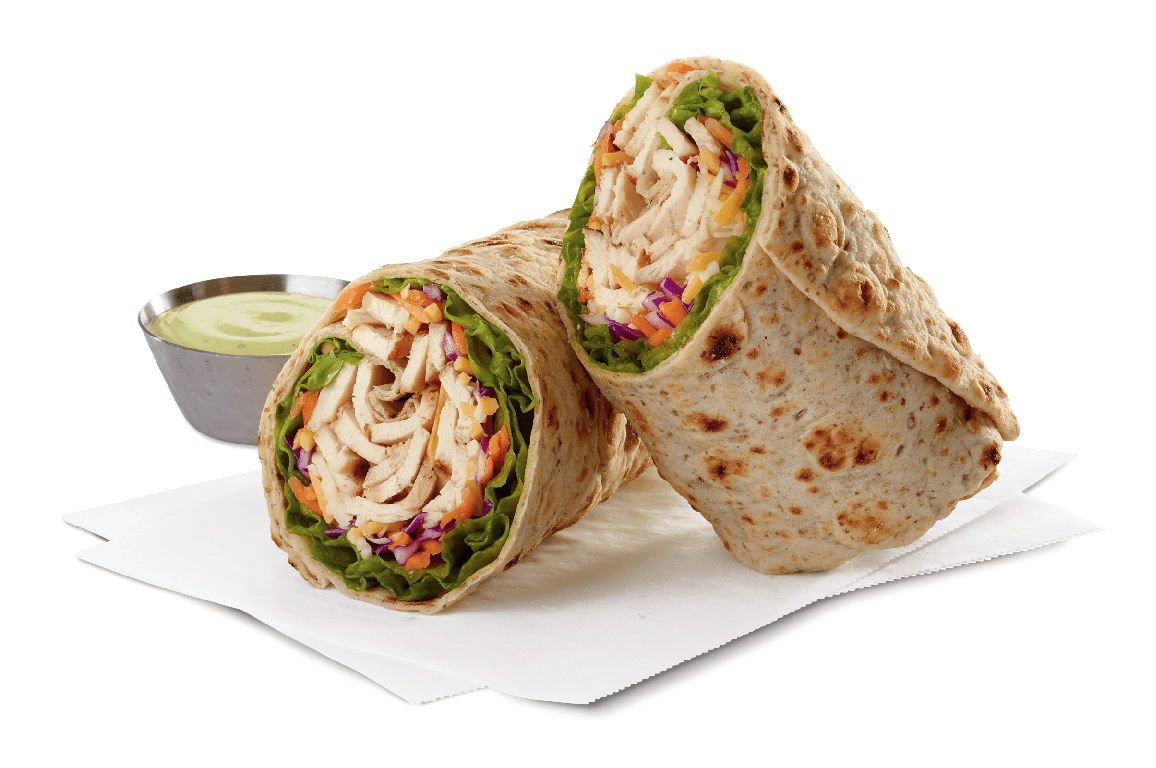 Sliced grilled chicken breast, nestled in a fresh mix of Green Leaf lettuce, petite red and green lettuce, and shredded green cabbage with a blend of shredded Monterey Jack and Cheddar cheeses, tightly rolled in a flaxseed flour flat bread. Made fresh daily. Served with your choice of dressing.