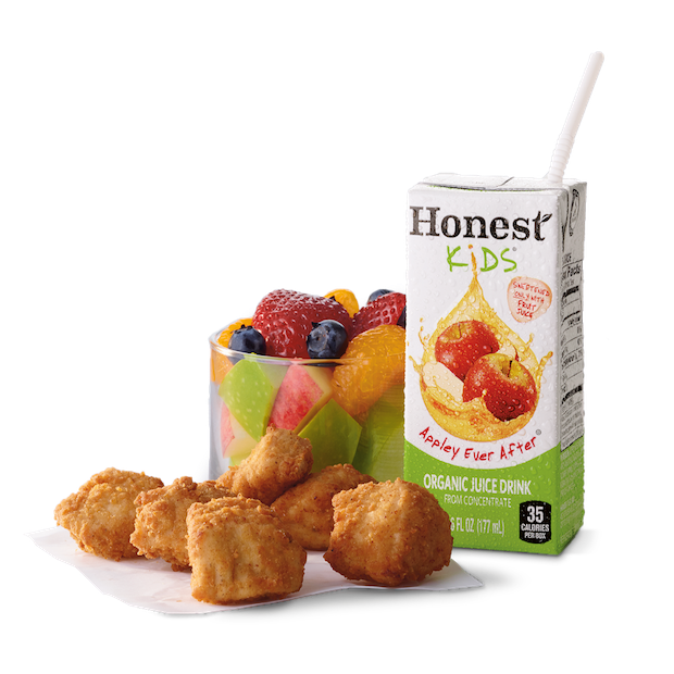 Includes a 4-count or 6-count of Chick-fil-A® Nuggets, a choice of a small Side Item (Cinnamon Apple Sauce, Waffle Potato Fries™, or Fruit Cup), a kid’s size drink and a special surprise.