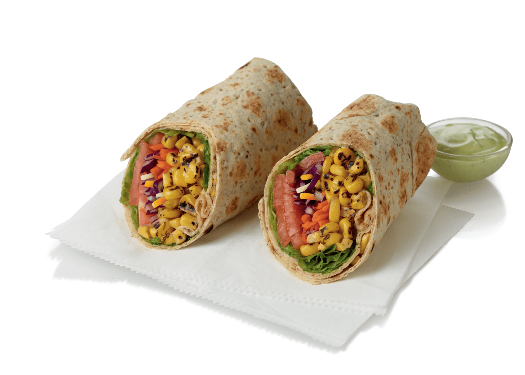 Tomato slices, a zesty combination of poblano chiles, red bell peppers, roasted corn and black beans nestled in a fresh mix of Green Leaf lettuce and shredded green cabbage with a blend of shredded Monterey Jack and Cheddar cheeses, tightly rolled in a flaxseed flour flat bread. Made fresh daily. Served with your choice of dressing.